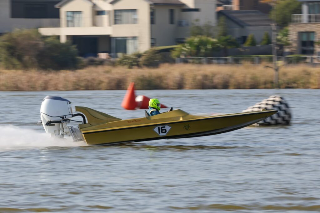 The large crowd that attended the powerboat festival on the Ebotse Dam in Rynfield were treated to some of the best racing action seen in many years as Repsold who was running a 2 litre motor tried every trick in the book to pass Wessels who has upgraded to a 2.5 litre motor on his South African built Caudwell hull. The boats of both Wessels and John-Ross Duncan were built by Caudwell Marine by Hi-Tech Automotive for on the outskirts of Gqeberha many years ago and were fitted with Nissan V6 inboard engines and were raced in the World F1 Series with little success as they kept snapping the orbital drive shafts. The boats returned to South Africa and have been shortened, had transoms fitted to now use an outboard motor and have been developed into top contending boats in the local championship.