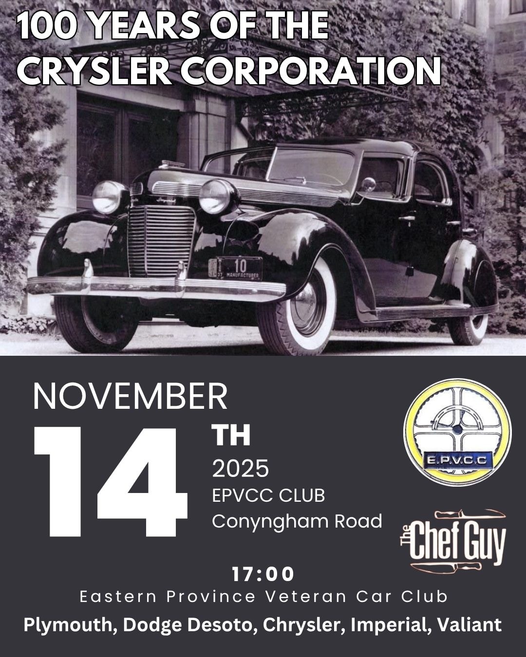 14 November @ 17:00 - 20:00 100 Years of Chrysler Display The Eastern Province Veteran Car Club EPVCC Clubhouse, Conyngham Rd, Glendinningvale, Gqeberha, South Africa