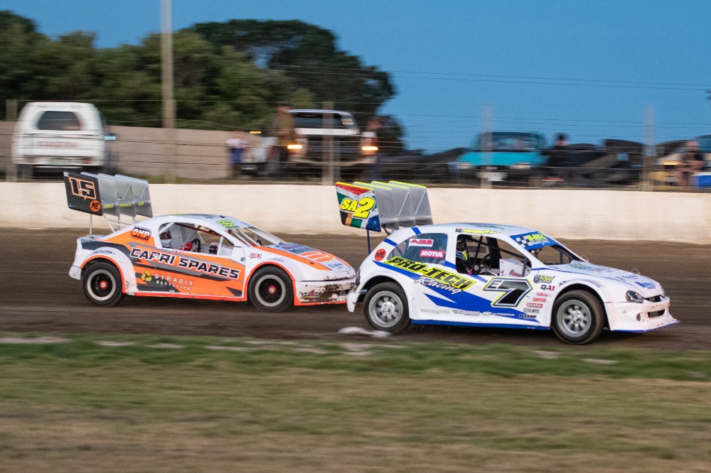 The large crowd that had gathered at a somewhat chilly Victory Raceway in Walmer were treated to racing of a high standard on Saturday night during the second round of the DO4SA Regional Dirt Oval Championship. The highlight of the night was the battle for supremacy in the very competetive 1660 Modified Saloon class that had the crowd on their feet in not only the final, but during the three qualifying heats as well. Nadia Rautenbach, Kenzo Barnard, Marthinus Muller and Jason Drake put on a tremendous display of hard clean racing out front breaking away from the thirteen strong field of cars. Muller won the opening heat in fairly dominant fashion, but was made to work for the overall win in the final as 16 year old Rautenbach won heats two and three putting in a very mature drive under immense pressure from Kenzo Barnard and Muller. Unfortunately Barnard suffered gearbox failure and was not able to make it out for the final and Jason Drake also withdrew with mechanical failure. A hard fought final saw Rautenbach as the early leader but relentless pressure from Muller saw him snatch the lead only for Rautenbach to get back in front with two laps left in the race. Unfortunately Rautenbach had gone to deep into the corner that allowed Muller to get back into the front and cross the line in first place. A consolation for Rautenbach was the unaminous decision to be voted as the driver of the day.